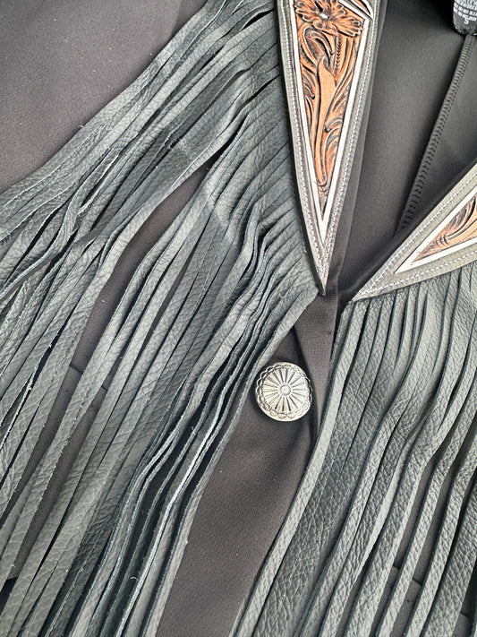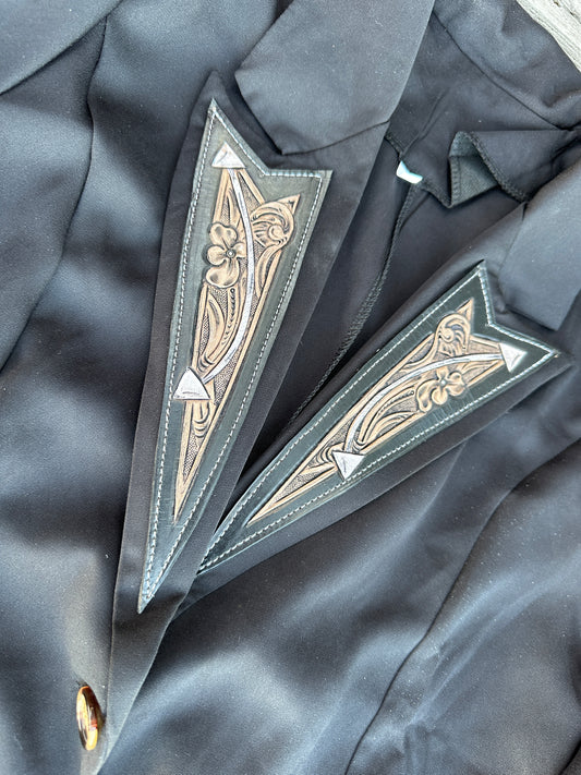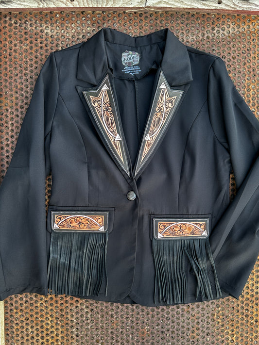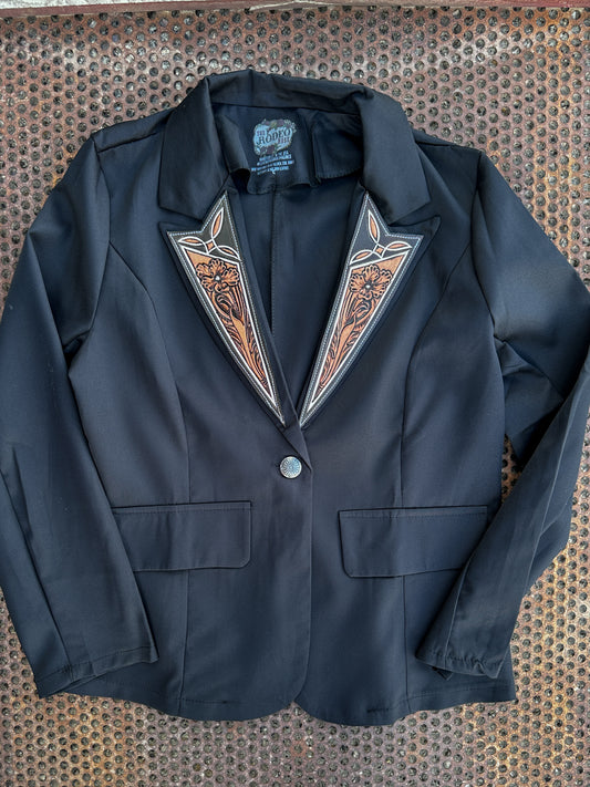 Make a statement in the arena or the office with our hand-tooled leather lapel blazer! Designed by Amanda Rose and crafted with the finest leather from the Rodeo Rose shop nestled at the base of South Dakota's iconic Black Hills. Perfect for every cowgirl, this versatile piece transitions seamlessly from work to play, ensuring you're always dressed to impress. Elevate your wardrobe with timeless style and quality craftsmanship.