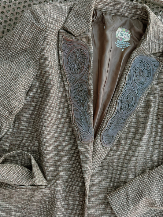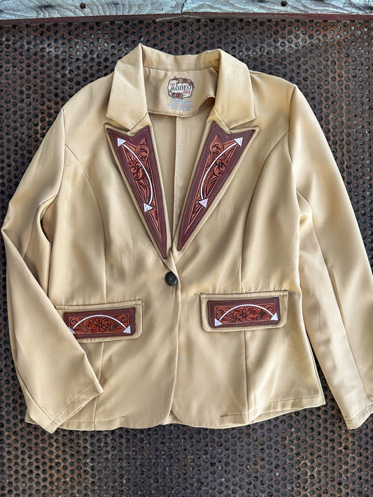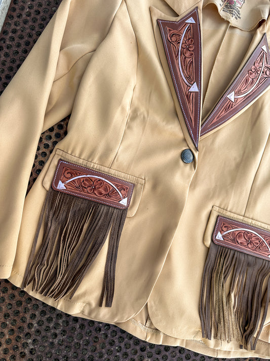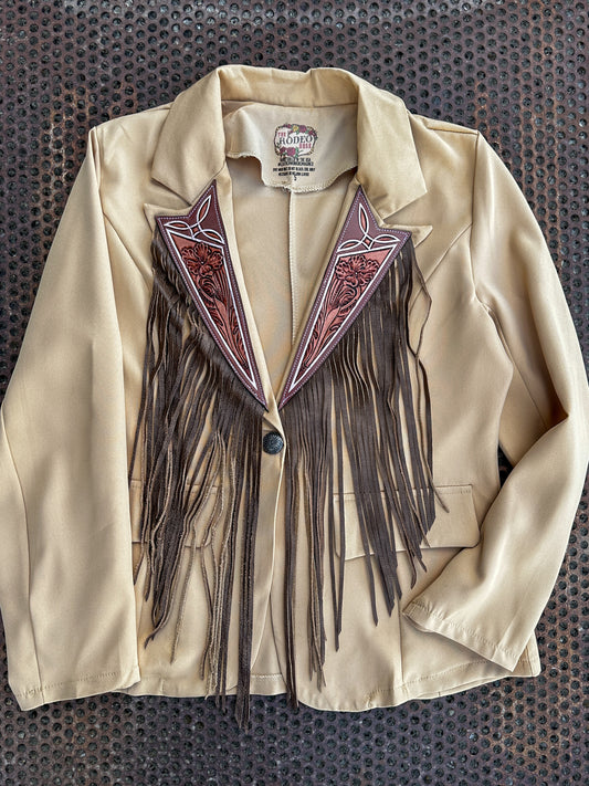 Boot stitch hand tooled lapel blazer with fringe in tan