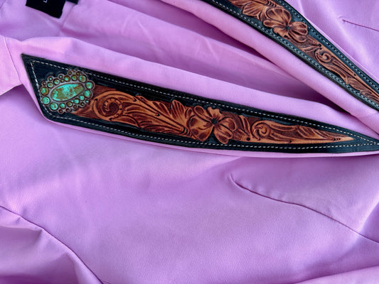 “Tough enough to wear PINK” hand tooled lapel blazer with turquoise