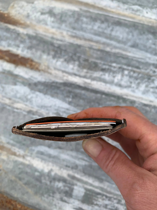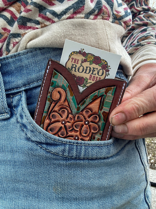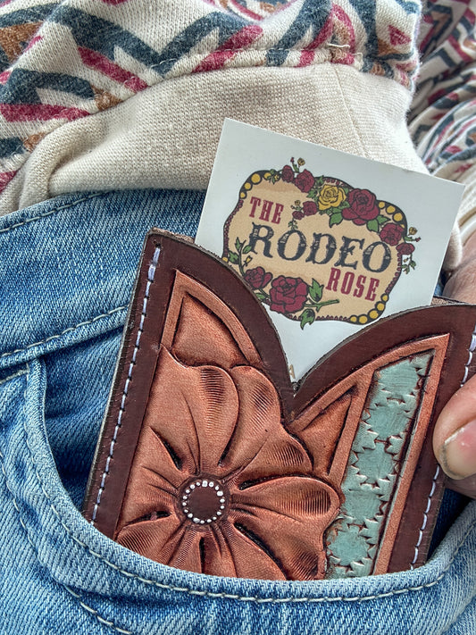 The Rodeo Rose presents a sleek and versatile solution for your everyday essentials with their front pocket wallets. Slim enough to slide effortlessly into your pocket yet spacious enough to hold your cards and cash, these wallets offer both convenience and style. Meticulously handcrafted from premium leather, each wallet features original hand-drawn designs by Amanda Rose, adding a touch of Western charm to your everyday carry. Whether you're out on the ranch or navigating city streets, these wallets are the perfect companion, effortlessly transitioning from your pocket to your purse with ease. With their durable construction and timeless design, The Rodeo Rose front pocket wallets are not just practical accessories but also statements of quality craftsmanship. Hand-sewn with care in The Rodeo Rose Shop, located amidst the picturesque beauty of South Dakota's Black Hills, these wallets are a perfect blend of form and function for the modern cowboy or cowgirl.