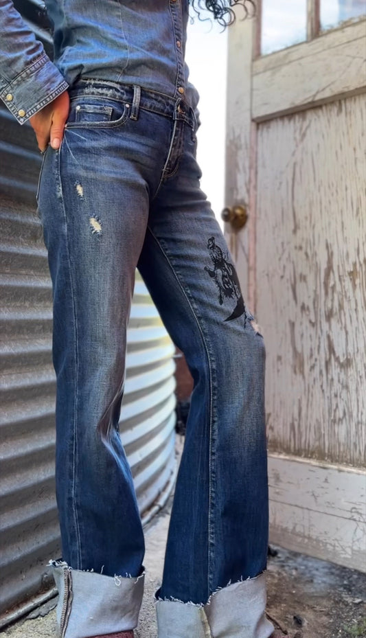 Step into Western style with The Rodeo Rose's denim jackets, adorned with hand-drawn graphic and hand-tooled leather pattern. These denim jackets are more than just outerwear—they're wearable works of art that combine rugged charm with contemporary flair. Each jacket features unique designs, from intricate floral patterns to bold Western motifs, meticulously crafted to make a statement wherever you go. Whether you're exploring the great outdoors or hitting the city streets, these denim jackets add a touch of Western authenticity to any outfit. Designed and made with care in The Rodeo Rose shop nestled amidst the breathtaking landscapes of South Dakota's Black Hills, each jacket is a testament to quality craftsmanship and artistic creativity. Elevate your wardrobe with The Rodeo Rose's denim jackets, where every piece is a wearable expression of Western heritage and adventure.