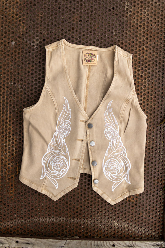 Hand Tooled Floral Scroll Pattern Printed Vest in Tan
