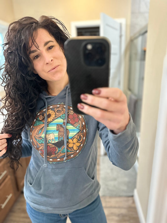 Embrace the allure of the west with The Rodeo Rose's hooded sweatshirts, adorned with hand-drawn Western graphics by the skilled artist Amanda Rose. Each design intricately captures the essence of the Wild West, from hand tooled leather patterns to iconic rodeo scenes. Crafted with comfort and style in mind, these hoodies are perfect for cool evenings around the campfire or exploring the untamed wilderness. Printed with precision in The Rodeo Rose shop nestled amidst the picturesque beauty of South Dakota's Black Hills, these hooded sweatshirts are a testament to quality craftsmanship and Western tradition. Whether you're hitting the rodeo road or simply embracing your inner cowboy or cowgirl, these hoodies are more than just clothing—they're a reflection of your love for the west. Wrap yourself in Western charm with The Rodeo Rose's hooded sweatshirts, where each hoodie is a wearable piece of Western artistry and adventure.