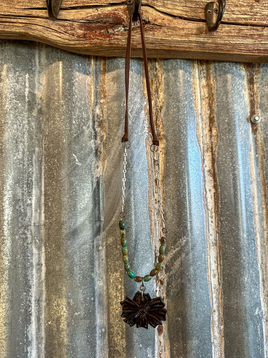 The Mabel Necklace with Green Turquoise Beads and Handtooled Leather Flower Pendant