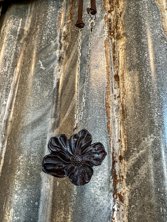 The Mabel Necklace with Handtooled Leather Poppy Pendant and Paperclip Chain