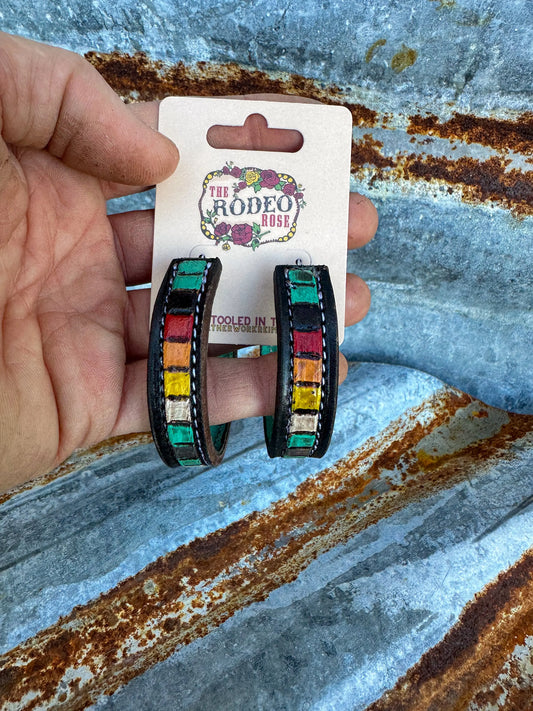 The Tad Hand tooled Leather Earring with Turquoise Border