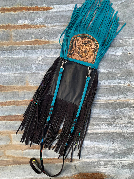The Arena Leather Fringe Purse with Hand Tooled Sunflower and Confetti Acid Wash Hair on Hide