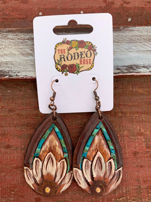 The Tad Hand tooled Leather Earring with Turquoise Border
