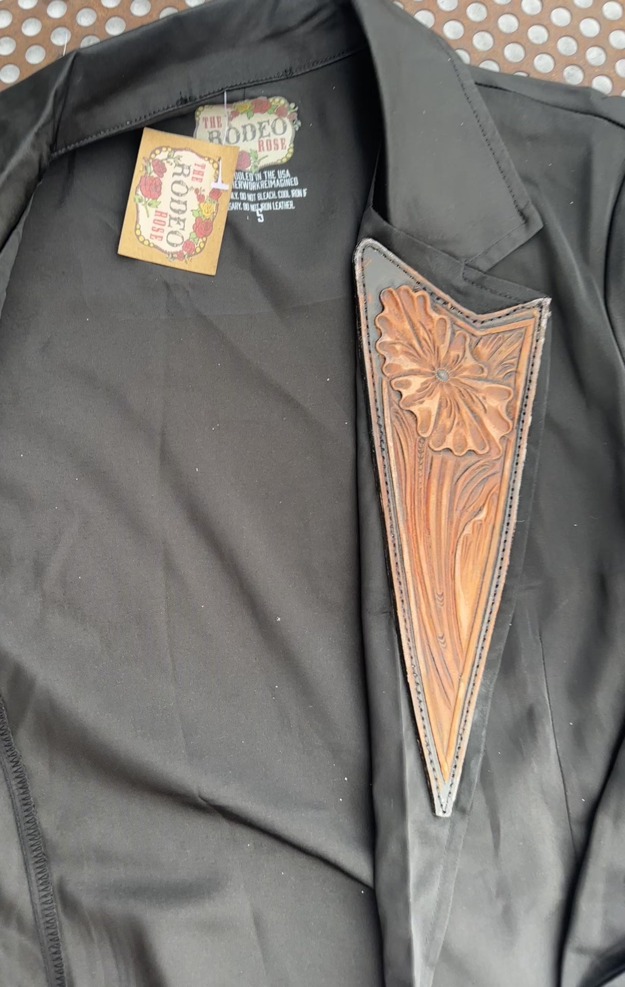 Elevate your wardrobe with our Hand Tooled Distressed Lapel Blazer in black satin. Each piece is hand tooled in the black hills of South Dakota, making it truly one-of-a-kind. The rich brown and black leather pattern adds a unique touch, perfect for dressing up or pairing with jeans. With front pockets and scrunched 3/4 sleeves, this blazer not only looks great, but also fits true to size. Don't miss out on this original and small run from The Rodeo Rose!