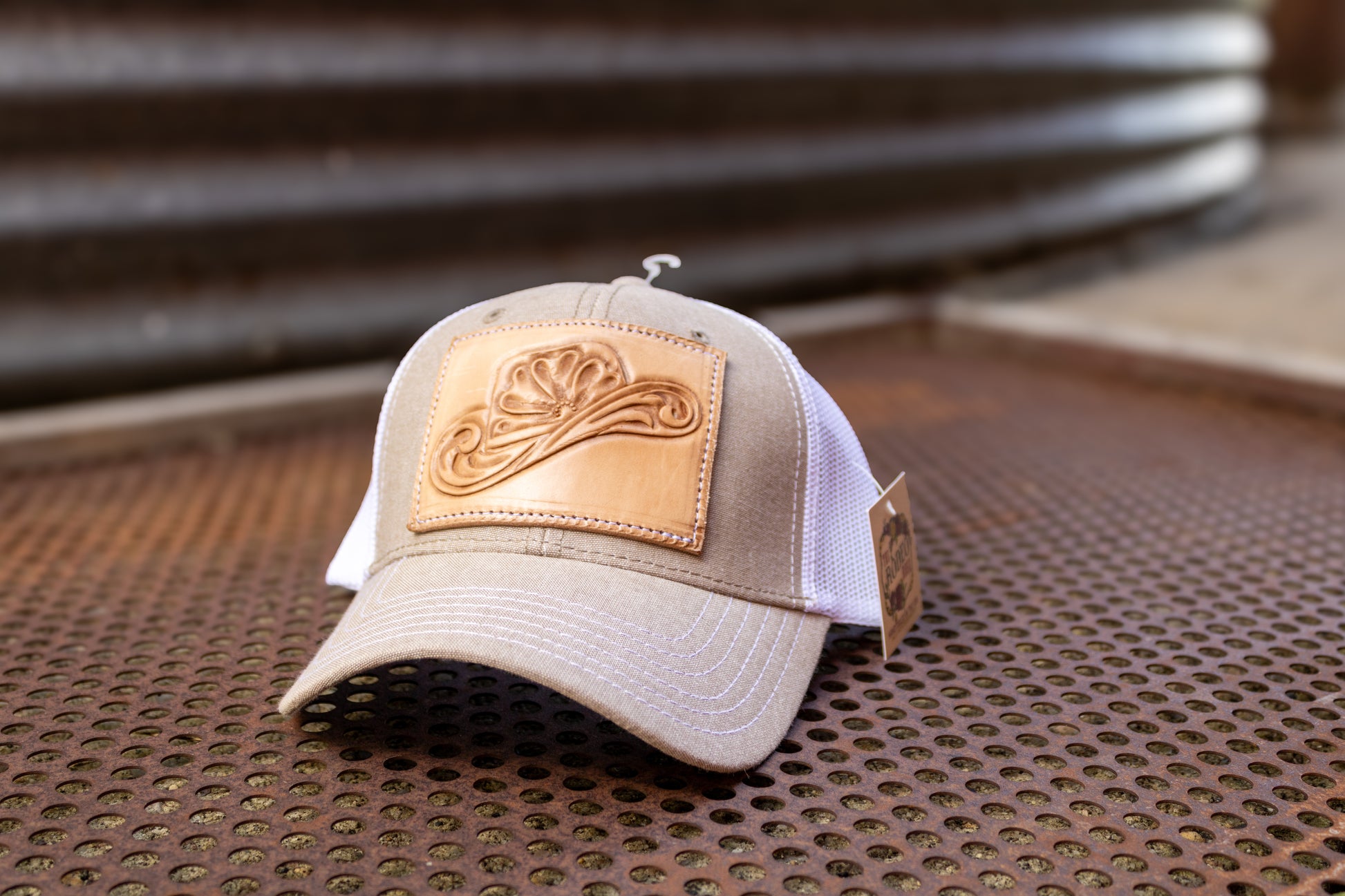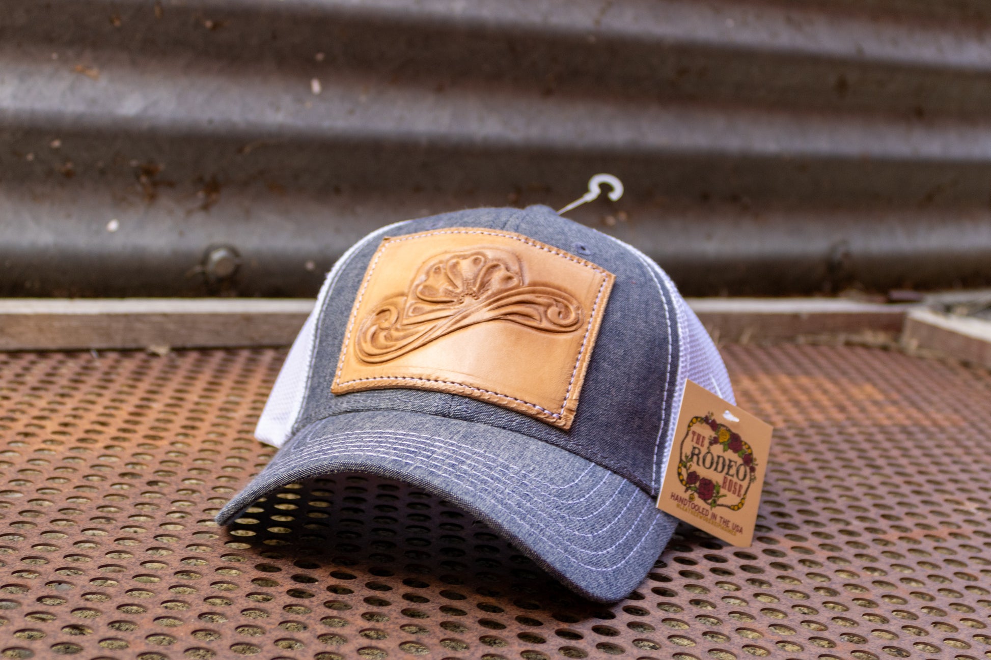 Tooled Cowboy Hat Leather Patch Chambray Low Profile Trucker Cap